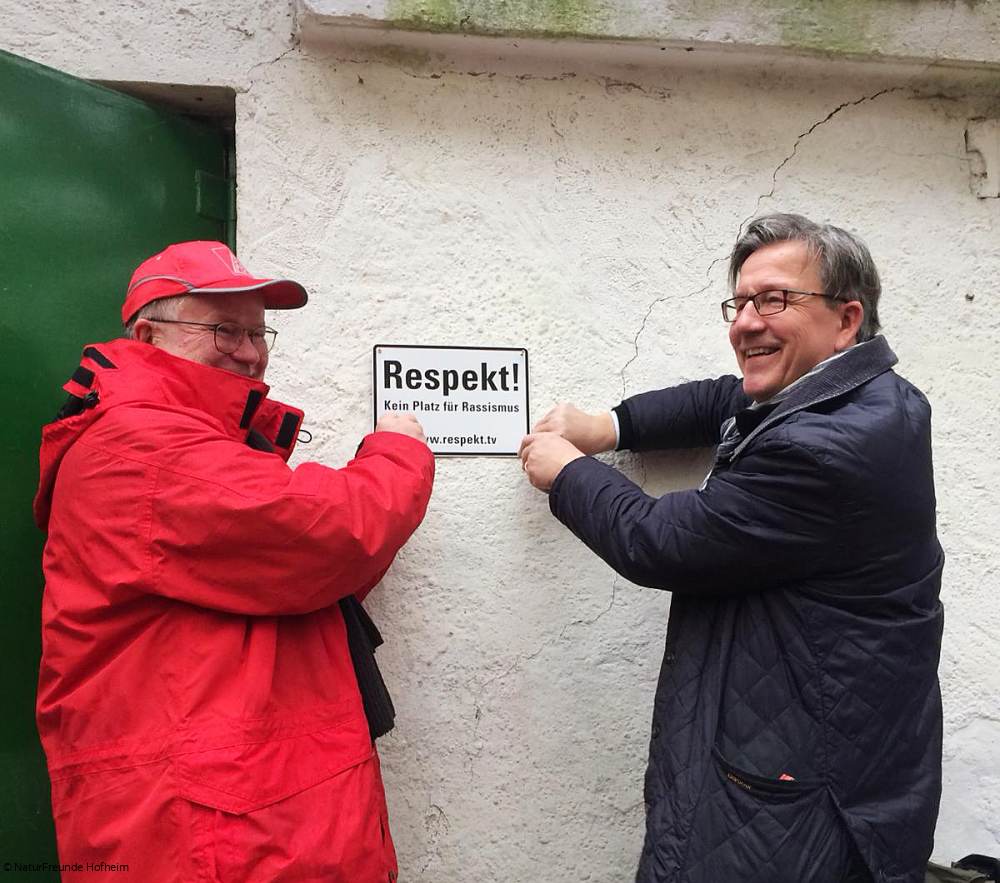 Höhepunkt der Aktion war ein Beitrag der IG Metall, die sich ebenfalls gegen Rassismus engagiert. Thomas Kasper von der Geschäftsstelle der Gewerkschaft in Frankfurt brachte gemeinsam mit dem Vorsitzenden der Hofheimer NaturFreunde Bernhard Köppler ein Schild mit der Aufschrift „Respekt! kein Platz für Rassismus“ an der Schutzhütte der NaturFreunde an. In ihren Ansprachen hoben Kasper und Köppler, die Bedeutung des Engagements jedes einzelnen im Kampf gegen Rassismus und für Demokratie hervor.